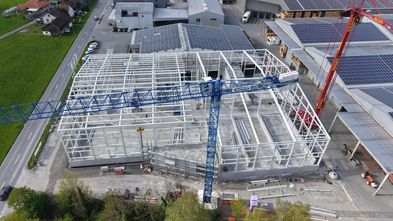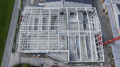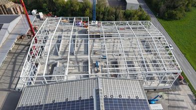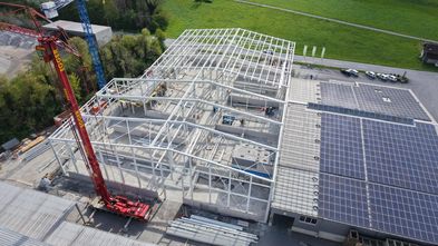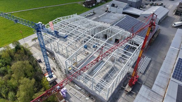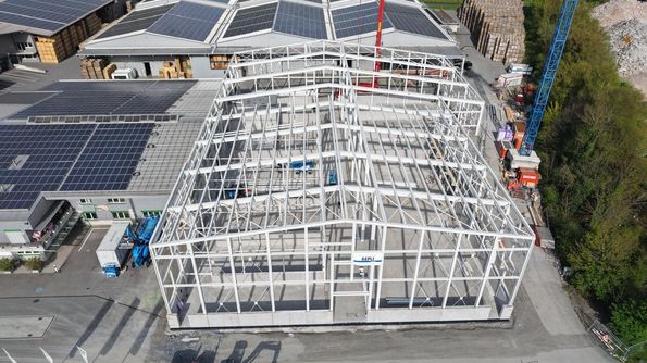 Der Stahlbau der neuen Halle ist fast abgeschlossen – ein weiterer wichtiger Meilenstein auf dem Weg zur Fertigstellung.