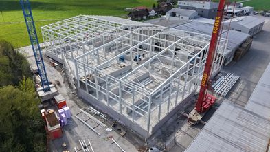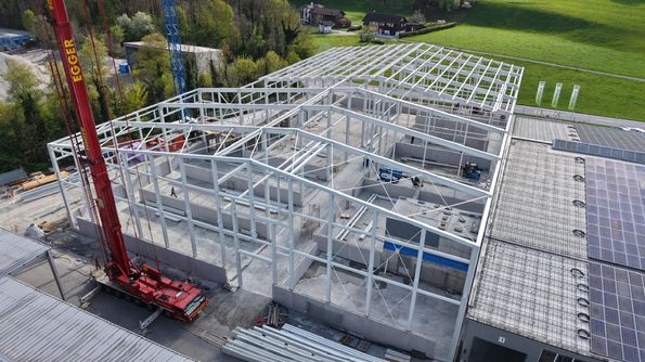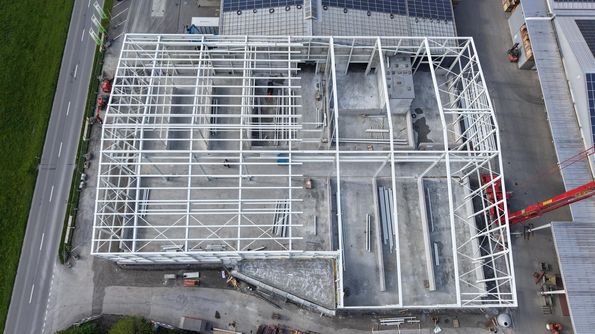 Unsere neue Halle nimmt immer klarer Form an: Der Stahlbau ist weit fortgeschritten und der Rohbau nahezu fertiggestellt. Damit erreichen wir einen weiteren wichtigen Meilenstein in unserem Bauprojekt. Der Baufortschritt ist nun nicht nur auf Plänen, sondern direkt vor Ort eindrücklich sichtbar. Mit diesem wichtigen Etappenziel schaffen wir die Grundlage für den nächsten Abschnitt unseres Projektes – Schritt für Schritt wächst hier neue Infrastruktur für die Zukunft.