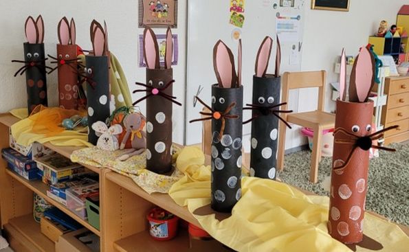 Passend zur Osterzeit wurden aus den Kartonrollen zudem fröhliche Osterhasen gebastelt. Mit Farbe, Ohren, Wackelaugen und viel Liebe zum Detail entstanden charmante Figuren, die zeigen, wie aus etwas Schlichtem mit Fantasie etwas ganz Besonderes werden kann.